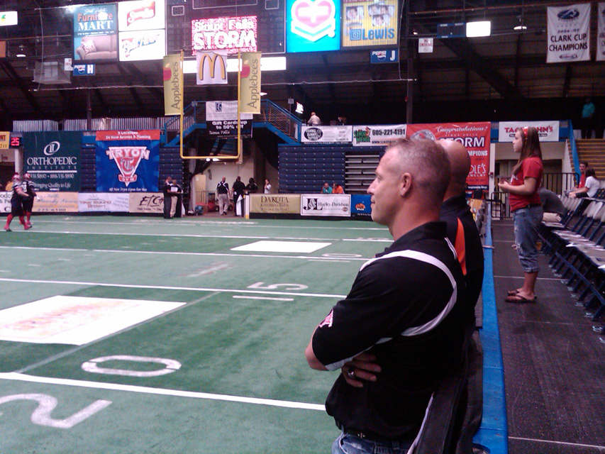 number one seed in their division. Go Storm!!Welcome To Tryonville!! Have you been to Sioux Falls, lately? There are Tryon signs EVERYWHERE!! RT, JJ, Jerilyn and myself went to the Sioux Falls Storm playoff game Saturday and I saw Tryon Gym signs and logos everywhere I looked. On the field, on T-shirts, on the uniforms, on the sidelines, they dominate the advertising. What a great time we all had. There were tornado warnings in the area. During the National Anthem, when the singer got to "and bombs bursting in air", there was a HUGE clap of thunder and all of the lights in the arena went out. The people kept singing. The lights came on shortly. Todd, the owner of the Storm, must have planned it that way as The Storm were running onto the field.. We had the best seats in the house and we all had such a great time as the Storm scored right before the half to make it 7-6 against their arch rivals, the Omaha Beef. The final score was 42-23 in favor of the Storm, who now advance to the next round against Green Bay at Sioux Falls.. Gooooooo Storm!! A big Thanks to Todd for showing us such a memorable time. (photo by Randy) Notice the Tryon Gym sign in the background as Todd discusses the pre-game strategy. |