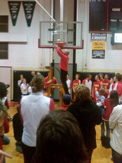 Wins!!Carroll Kuemper has made it to state in high school boys basketball and Who is that bald guy cutting down the nets? Why it is Tyler, who has helped coach the Knight to state this year. Way to go Tyler!! The Knights won 52-50 against Emmetsburg @ Fort Dodge. Photo by JJ. |