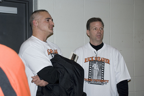 Of The Road.......A couple of weeks ago, on a Saturday, I actually left my easy chair and drove to Lamoni, Iowa to watch Rick Weaver coach his last game. I thought it was very appropriate as I was there for his FIRST game in 1973 at Jefferson High School. Rick has been the head basketball coach at Baker University for the past 25 years and he previously coached at Jefferson HS (with Jerry and I), Westmar, Wayne State and then Baker. He has always been a great friend to me and to our family. The Thursday before his last game, Baker University in Baldwin, Kansas held a Rick Weaver Night for his last home game. The gym was packed, t-shirts were handed out and many, many friends and players were there to show their appreciation for his years of service to not only the school, but also the community. Before his last game, I had the opportunity to visit at great length with Rick. He is doing well, except he is having both knees replaced this month. He wished us all the best and hopes to get up to Iowa for some relaxation and golf this summer Rick and I shared a house back in our Jefferson days and we both have quite the stories to tell. Mine are true, but he has been known to fudge around the edges. I listened on the internet to the pre-game, game and post game of Rick's big night and I thought it was Mother Teresa being honored. Now, I remember him getting into it with AAU basketball opponents (pushing, then running away), spilling stuff all over rich KC Royals fans (numerous times) and always having me sneak in or out of our house when he was "entertaining" a lady friend or two. Mother Teresa? That can't be the Rick Weaver I know. Rick may be the worse card player ever and he may be full of crapola most of the time and I constantly had to carry him on the tennis court or show him how to play "hustle golf", but he sure has those people in Kansas fooled!! (hustle golf is when you run from shot to shot to rattle your league opponents) I know all of the Tryons wish Rick and his family a long and prosperous future. If you look REAL close at the first picture after clicking it, notice the scout in the background, at least that is what Graceland thought. Now who would scout the last game of the season? Photo found on Graceland site by WW. Second picture is Rick's last home game. As you can tell, he never was a snappy dresser. Is that a Johnny Carson sport coat? Once, his mother came up to me and asked if I could help Rick pick out some clothes that would actually fit. Maybe something a little more in style with the times. (Rick loved pastels, it was hard for him to give up those pink shirts) The third picture shows those cheap t-shirts that were bought for the occasion. Not a high quality Graphic Edge product. Hey,I would use my coat to cover it up too. I will bet those t-shirts get a lot of wear after the big night. A real collector's item. Notice the 1970's picture of Rick on the front. Still living in the disco days. Fourth picture is a classic. Did he just see the movie "Walk The Line"? The man in black, see I told you he was "clothing dysfunctional" and they still do not fit. Geeze, keep the jacket on! Here are a couple of stories of Rick's final games and the legend continues..... Click For Story 1, Click For Story 2 Click For Story 3 (the laundry man) |
