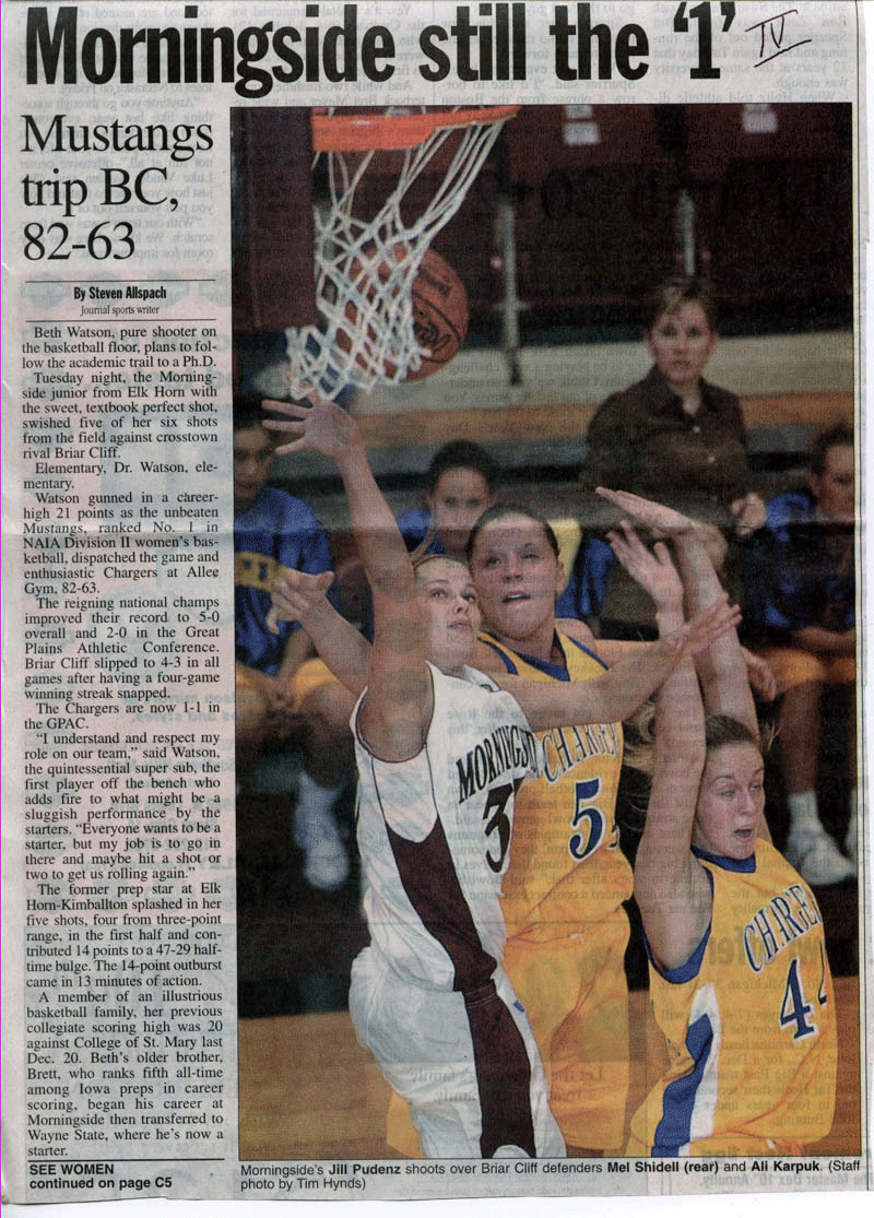 Mustangs Win Again! Defeat Nebraska Wesleyan 84-53, Beth scores 6!! Morningside Sets School Record 21 WINS!! (21-2) Beth made at least 3 three pointers as the Ponies win 119-95 over a very tough Northwestern team. Beth is averaging over 8 points a game and is #4 on the nationally ranked team in scoring! Way to go Bethie!! Huge Comeback For WSC, Win 69-58 Brett scores 9, and helped to lead the second half thriller. The Cats were behind 30-16 at half time, Brett and one other player had scored ALL of the points. Mark, the announcer, said it was the greatest comeback he has seen in 47 years of announcing! (Didn't he say that last week, too?) Way to go Brett!! WSC Thumped 87-73 By Tough Northern State! Brett scores 17 points with 8 of 12 shooting!! Northern shoots 70% from the field. |