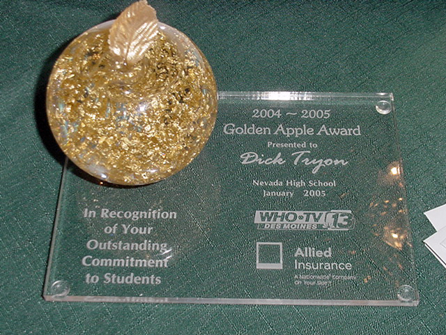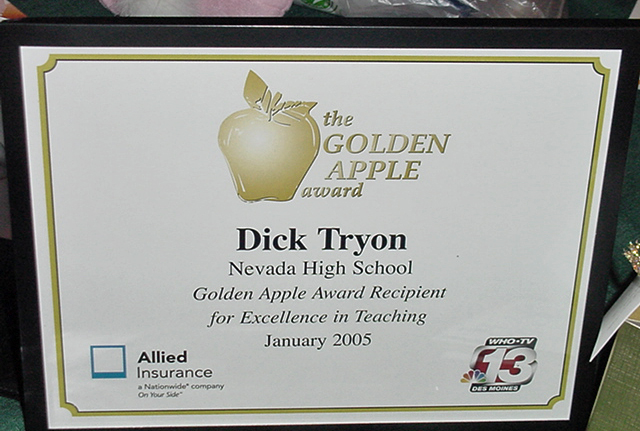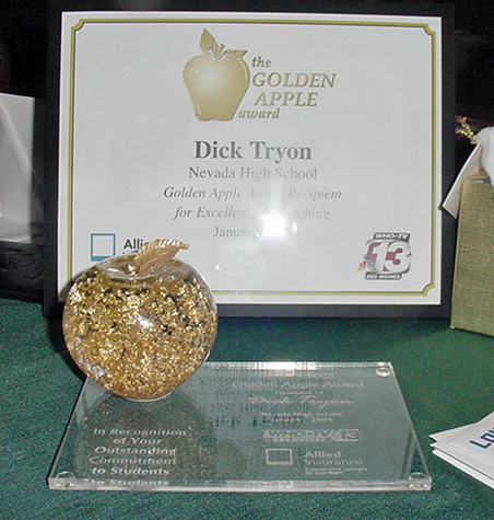 Unbelievable!! What is the world coming to?? People kept popping in all day, teachers, friends and students, congratulating me. I was starting to wonder if this award was presented posthumously. It was pretty darn embarrassing. It was really super for the students to do this, but there are so many more deserving teachers, everywhere.....anywhere..... I am not even one of the best teachers in my hallway. I do have fun in class. I got a great way of doing Current Events, which I start out most days with. I have two great subjects to teach. American History, which to me is just a collection of stories. I love to read history anyway and then will put together a great story about Black Hawk Down or the Titanic or the JFK Assassination. I also teach Economics, where I use my eBay experience, stock simulations and old baseball card show stories to clarify the economic principles.I use lots of visuals (slide show stuff), music and competitions. (stock simulations etc.) I do have www.tryonuniversity.com., that I am really proud of and this year I now have a sign up for the Tryon University Newsletter. (which you are welcome to do at www.tryonuniversity.com ) It is a monthly publication that I send out to keep in touch with the former students and current ones. Some parents have also subscribed and I run a couple of competitions off of it. Mainly, my classes are just kind of fun, taught by the school clown, or Village Idiot. (it takes a village you know) I can just imagine the rolling of the eyes that are going on in the other buildings and other places I have taught. Man, has education sunk this low? Anyway, what a day. Barb knew nothing about this until she got home from her new job at Principal. It was good for Nevada to get some positive publicity after the Homecoming mess last year and we have always had a lot of really great kids......You know, they could have created a monster with this, I have already asked the Principal if Award Winning Teachers need to attend staff development and our weekly meetings. This may say a lot for doing things the way you want to do them and not the way you are suppose to..... Anyway, it was, quite a day.......the longest day. |
